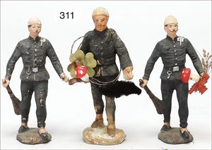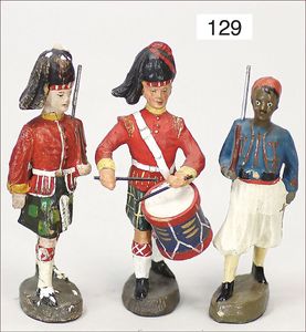 3 Figuren 1. Weltkrieg, 10 cm, Masse, schott. Trommler, farbl. etwas ausgebessert, 1 Schotte marschierend, 1 Figur marschierend, wohl farbl. Ausgebessert