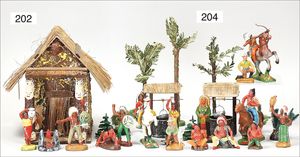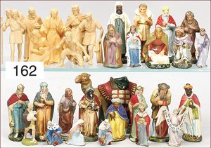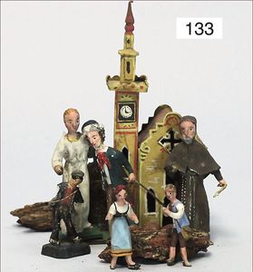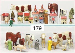 Fundkiste, wohl ERZGEBIRGE, früh, Holz/Masse, sakral, Figuren 6 cm, ca. 10 Teile, meist beschädigt, dazu einige Gebäude, schönes Konv. zum restaurieren