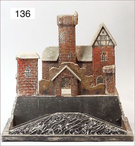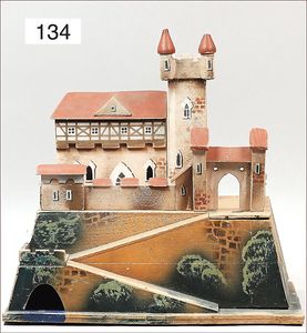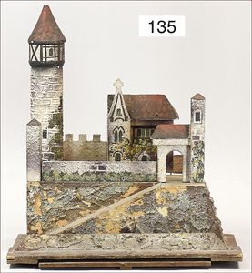Ritterburg, Holz/Masse, ca. 1925, 38 cm briet, 31,5 cm tief, Turmteil, Gebäudeteil, Mauerteile, bespielter Orig.-Zust.