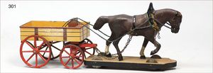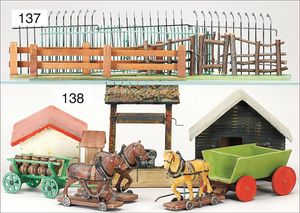 ELASTOLIN Holz/Masse, Brunnen, dazu Blockhütte, kl. Bauernhofhäuschen, einige Zugpferde, Leiterwagen, guter Zust.