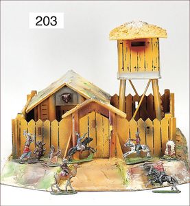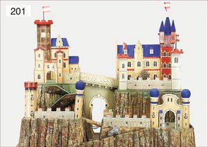 Ritterburg, Holz lackiert, Grundplatte 49 cm x 36 cm, ca. 1930, bespielt, gut