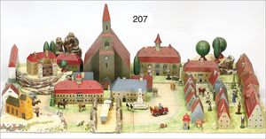 Ritterburg, Holz/Masse, 41 cm x 37 cm, Turmteile, Mauerteile, bespielt, altersbed. Masse-Fehler, Orig.-Zust., ca. 1925