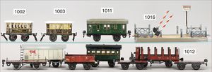7 Teile Güter- und Personenwagen, 2-achsig, meist BING Spur 0, Kohlewagen, Viehwagen, gedeckter Güterwagen, Schlafwagen, Planewagen, teils gut, teils stärker bespielt, Lackfehler