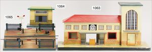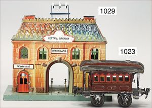 MÄRKLIN kl. Landbahnhof, Blech handlackiert, Grundplatte 40 cm x 16,5 cm, Höhe 21 cm, Wartesaal, Telegraph, Durchgang, kl. Vordach, Seitendach, mit Bank, unbespielt