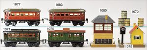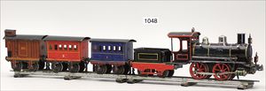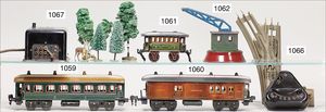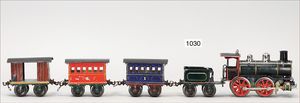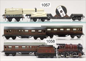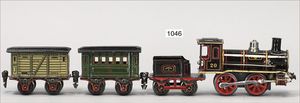 MÄRKLIN Spur 1, Uhrwerk Lok B, 36,5 cm, schwarz mit roten und goldenen Zierlinien, Uhrwerk intakt, Laternen ergänzt, dazu 2 Personenwagen, 1 Güterwagen, sehr schöner Orig.-Zust., mit nur kl. altersbed. Lackfehlern