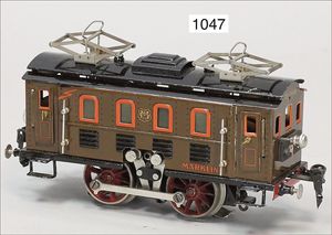 MÄRKLIN Spur 0, RS13050, E-Lok B, braun, 2 bewegl. Pantographen, 20 Volt, Federpuffer, altes MÄRKLIN-Zeichen, sehr guter nahezu unbespielter Orig.-Zust., im Orig.-Kart., 20,5 cm