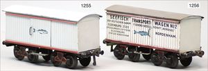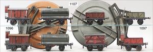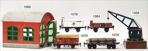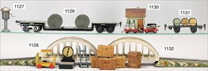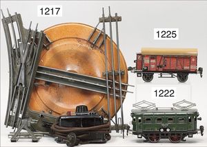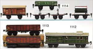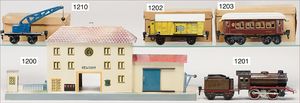 MÄRKLIN Spur 0, Uralt, Hochbordwagen, mit Bremserhaus, gedeckter Güterwagen, mit Bremserhaus, gedeckter Güterwagen, 2 Rungenwagen, 1 Tender, 1 Drehscheibe, alles in gutem, bespieltem Orig.-Zust.