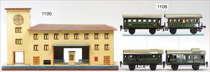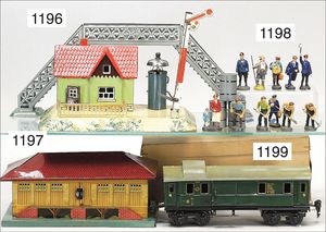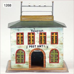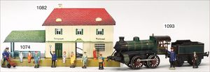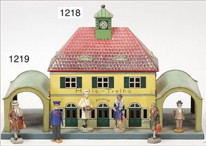 Bahnhof, Uralt, Blech handlackiert, Grundplatte 27 cm x 13,5 cm, kl. Vordach fehlt, Rückseite mit ein paar kl. Luftgewehr-Einschüssen, sonst Lackierung gut, Farben gut