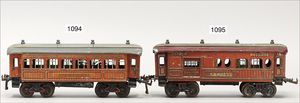 MÄRKLIN Spur 0, Zugpackung, bestehend aus Packwagen, 1873, Personenwagen, 1872, Tender, zu Uhrwerk Lok B, rot/schwarz, Gleismaterial und Karton, ohne Lok, guter Zust.