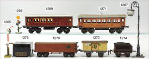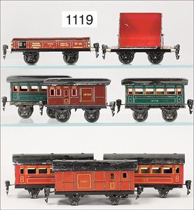 MÄRKLIN Spur 0, Konv. Güter- und Personenwagen, 7 Teile, bespielt bis gut, darunter 1873 Gepäckwagen, 1872 Personenwagen, 1731 Personenwagen, Kipplore, Niederbordwagen