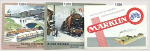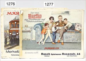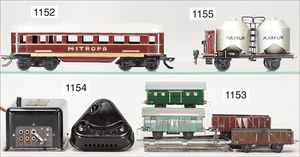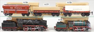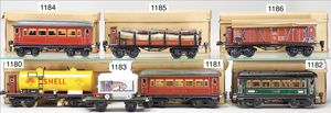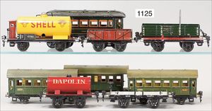 MÄRKLIN Spur 0, 4 Teile, Personenwagen, 1888, 4-achsig, 2 x 1731, 1727, 6 Güterwagen, darunter Tankwagen, Dapolin, 1 Fahrzeugtransportwagen, Rungenwagen, ohne Rungen, 1 Tankwagen, 1774, Shell, Kessel durchgerostet, teilw. nicht komplett, teils guter Zust., teils bespielt, insgesamt 10 Teile