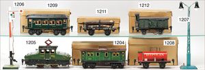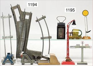 schöne Fundkiste, meist BING, Spur 0 und 1, 2 Schlepptenderlokomotiven, B, 2 Viehwagen, ohne Dach., 4-achsiger Güterwagen, dazu Kleinteile, MÄRKLIN und andere, Laternen, Schalter, einige Prellböcke