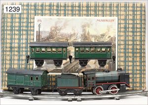 MÄRKLIN Spur 0, Konv. 4-teilig, 1732, Gepäckwagen, 2-achsig, grün, 1728, Gepäckwagen, 2-achsig, grün, 1727, Personenwagen, 3. Klasse, 1731, Personenwagen, 2. und 3. Klasse, bespielt bis sehr guter Zust.