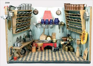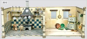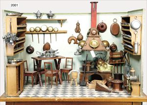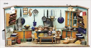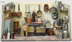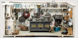 Puppenstubenküche, 75 cm breit, 41 cm hoch, 40 tief, reichhaltig Zubehör, Porzellan-, Blech- und Messingteile, mit Herd, alte Tapete, teilweise farblich ausgebessert