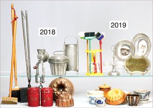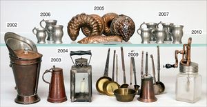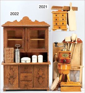 Zubehör für größere Küche, Holzteile, 1 x Wichskasten, 13 cm Lang, Waschreibe, Waschtisch, Kaffeeröster ''MUTZIG FRAMONT BREVETES'', 13 cm hoch, kl. Gewürzschränkchen komplett, 13 cm stehend, dazu Brettchen, Hackebeilständer, verschiedene Löffel