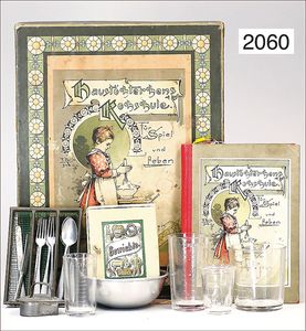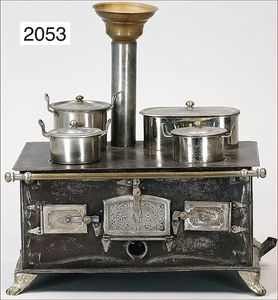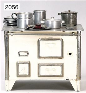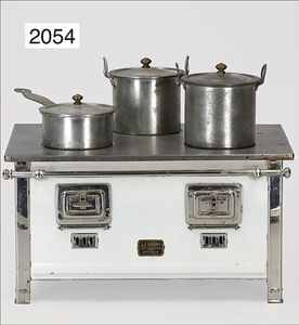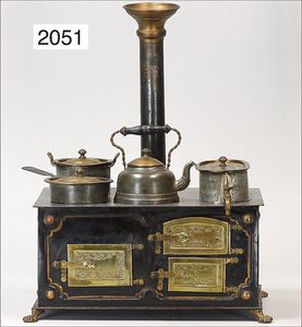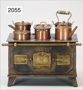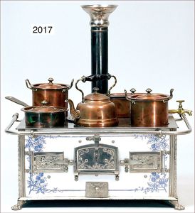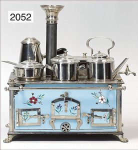 außergew. Puppenküchen-Herd, 31 cm breit, 36 cm hoch, 24 cm tief, Blech emailliert, vorne Blumendekor, seitl. auflithogr. Koch- und Spielszenen, Griffstange, Wasserschiff, Wasserkessel, Topfpfanne, Kakaokocher ohne Quirl, bis auf kl. altersbed. Emaille-Abplatzer sehr schöner Orig.-Zust., absolut selten