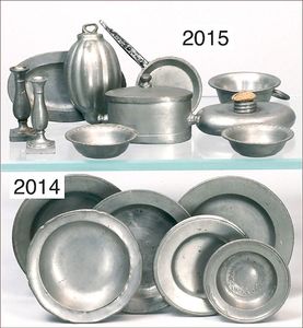 2 Puppenstuben-Wandteller, Zinn, mit Ansichten, 5,5 cm Durchm., grün und gold bemalt