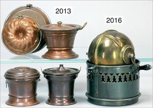 kleiner Puppenküchenherd, 23,5 cm, Messinggriffstange/ -türen, Kupfertopfsatz mit Wasserschiff, Deckel am Wasserkessel, sowie Schornstein fehlen, schöne Größe