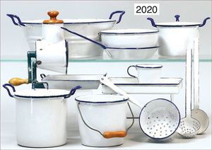 Küchenzubehör, für größere Küche, emailliert Reibe, Gewinde lose, 19 cm hoch, emaillierter Waschtisch, Bräter, Sieb, Töpfe, Eimer, Tassen, große Schale, schönes Konv. weiß/blau emailliert, bis auf kleinere Emailleabplatzer gut, mit altem Kart.