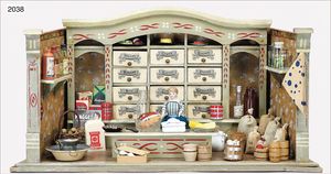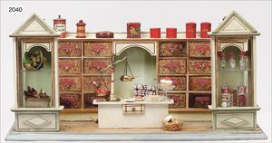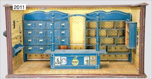 GOTTSCHALK Kaufladen, 73,5 cm breit, 37 cm hoch, alte Bemalung, Schubladen mit geschwungenen Blechschildern, Orig.-Theke, alte Wandtapete, reichhaltig Zubehör, 2 Dosen, Aufschrift: Erdbeerbonbons, Kaviar- und Fischdosen, handlackierter Wasserbehälter mit Becken, frühe Glasflaschen, Waage, Papierabroller, dazu Stubenpuppe, 15 cm, Biskuit-Kopf, -Arme u. -Beine, Stoffkörper