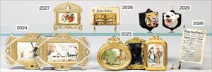 2 Puppenstuben-Bilder, Messingblech vergoldet, 1 x mit Haus am See, 7 cm hoch, 6,5 cm breit, 1 x Bild mit 2 Kinder und Eselwagen, 7 cm hoch, 4,5 cm breit, 1 x Spiegel, 6 cm hoch, 4 cm breit, schönes Konv.