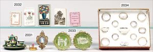 Porzellan-Puppenstuben-Service, in Orig.-Kart., gemarkt 2455/3, kl. und gr. Teller, Butterdose, Milchkännchen, Schale, 1 Teil ergänzt, Teller 2,5 cm Durchm., mit Goldranddekor