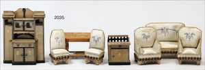 außergew. Sitzgruppe, Art Deco, umbautes Sofa, mit Spiegel, 16 cm breit, 23,5 cm hoch, Tisch 11,5 cm lang, 6 Stühle, 2 Sessel, im Orig.-Kart., teilw. hat sich der Kleber an den Polsterteilen gelöst, nahezu unbespielt
