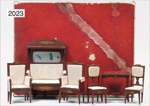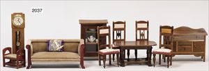 Wohnzimmerprogramm, 4 Stühle, in Holz gearbeitet, beiger Seidenbezug, 12 cm hoch, schöne Holzarbeit, 1 kl. Fußbank, 5 cm hoch, mit grüner Seide bespannt, 1 x Couch, 17 cm lang, 9 cm hoch, Samtbezug, 1 Schrank, Glastür, fest geklebtes Porzellanservice, 1 x Kommode, 13 cm lang, 9 cm hoch, 1 x Holzstanduhr, 15 cm hoch, Papierzifferblatt in Holz gearbeitet, 1 x Esstisch, 13 cm lang, 6,5 cm hoch, schönes Konv.