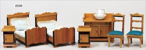 Puppenstuben-Schlafzimmerprogramm, 2 Betten, in Holz gearbeitet, 14 cm lang, 8 cm breit, blaue Bettdecke und Kissen, 2 kl. Nachtschränkchen, 7 cm hoch, 1 x Kommode, 10 cm breit, 8 cm hoch, mit Porzellanschale und Wasserkrug, 2 Stühle, 10 cm hoch, blauer Seidenbezug