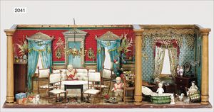 kl. 2-teilige Puppenstube mit lithogr. Papier beklebt, 3 Fenster ohne Fensterglas, auflithogr. Dekorationsstücke, seltene Sitzgruppe aus Nadelholzzweigen, Zinnleuchter, Schlafzimmermöbel, 2 Puppen, Zubehör, 56 cm breit, 26 cm hoch