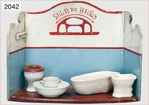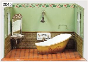 wohl MÄRKLIN kleines Puppenstubenbadezimmer, ca. 1910, Manufakturarbeit, 34 cm breit, 26 cm tief, Eckspiegel, mit Brause, Wasserversorgung, warm und kalt, schöner Orig.-Zust.