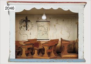Puppenstuben-Schule, 53 cm breit, 42 cm hoch, 34 cm tief, mit Dach, schöne alte Bemalung, Schulbänke, Tafel, Zubehör, früh