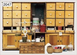 Rückwand für Kaufladen oder Apotheke, 61 cm breit, 39 cm hoch, Schubladen mit Beingriffen, Türen mittig verspiegelt, reichh. Apothekenzubehör, Glasteile, Holzschachteln, Keramikteile, 1 Waage, um 1900