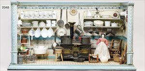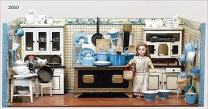 Puppenküche, ca. 1910, 102 cm breit, 44 cm hoch, 48 cm tief, alte Tapete an der Wand, Boden überstrichen, möbliert, mit Herd, Topfsatz am Herd nicht orig., reichh. Zubehör, blau/weiß emailliert, Porzellan-, Blech- Teile, 1 Biskuitporzellankopf-Puppe, ungemarkt, 29 cm, Kurbelkopf, braune festeingesetzte Glasaugen, off. Mund, oben Zähne, bespielter Gliederkörper, mit kl. älteren Ausbesserungen, alte Kleidung, alte Schuhe