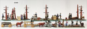 ERZGEBIRGE Holzschlag, 2 Fuhrwerke, Arbeiter und Bäume, Stämme, 1 Holzhacker, 1 x Jäger mit Hund, 1 x Frau mit Holzstoß, 1 x Mann mit Holzstoß, 1 x Aufseher auf Pferd, 2 Gämsen, 1 Reh, 1 Fuhrmann zu Fuß, Zeitzeugnis aus der Herstellung von Reifentieren aus dem Erzgebirge, museal, Höhe der Figuren ca. 7 cm, ca. 1890