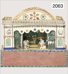 Kleines Papiertheater, ca. 1880, Druck handkoloriert, mit Kurbelantrieb, Antrieb hängt, 22 cm breit, 18,5 cm hoch