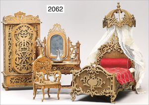 Möbelprogramm, Laubsägearbeit, Otto-Meier-Ravensburg, Schrank, 30 cm hoch, Frisier-Kommode mit Spiegel, Bett, Orig.-Bettzeug, mit Himmel, 1 Stuhl, schöne Arbeit