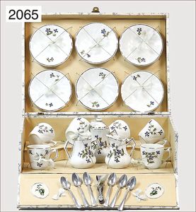 Kaffeeservice, Porzellan, Blumendekor mit Goldrand, Höhe Kaffeekanne 9 cm, 6 Tassen mit Untertasse, Zuckerdose mit Deckel, Milchkanne, Löffel, im Orig.-Kart., um 1900