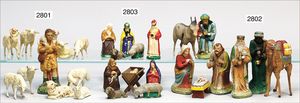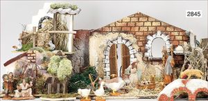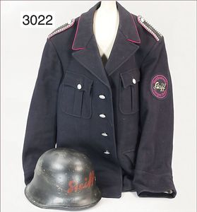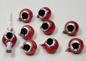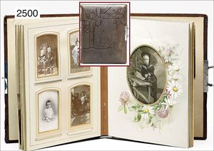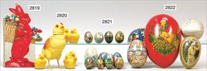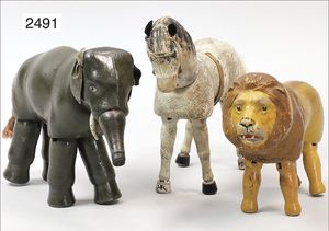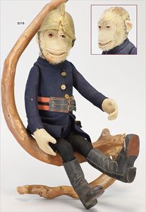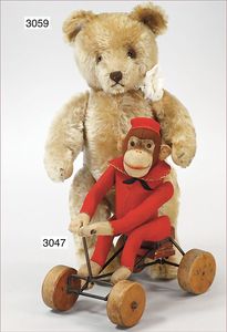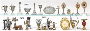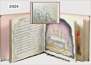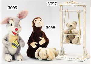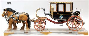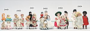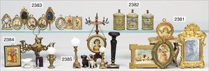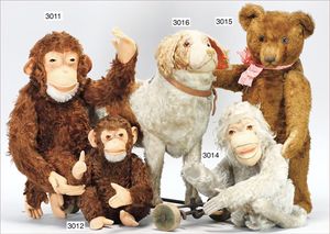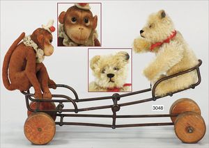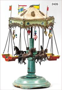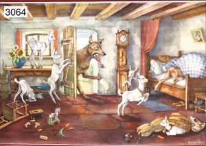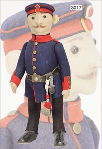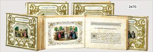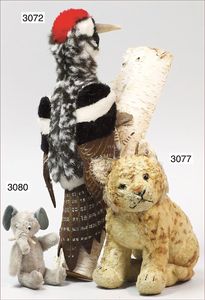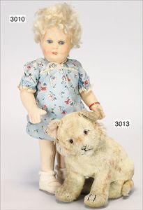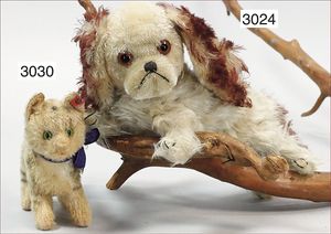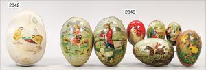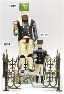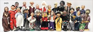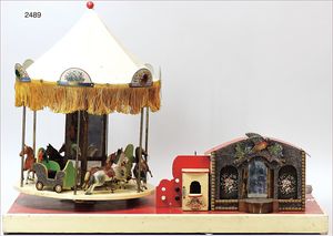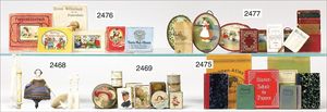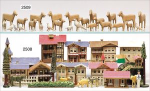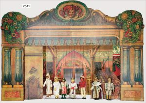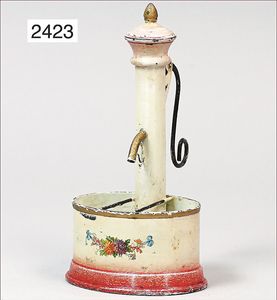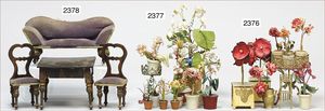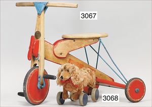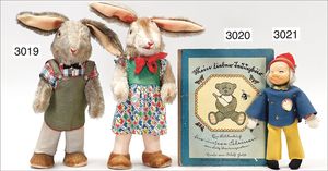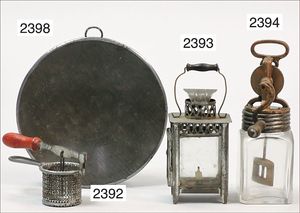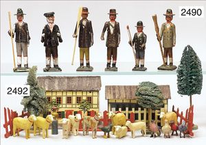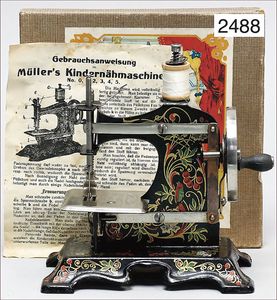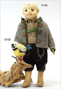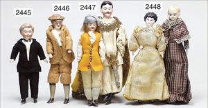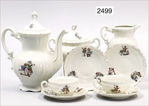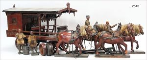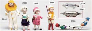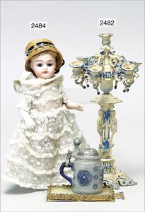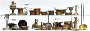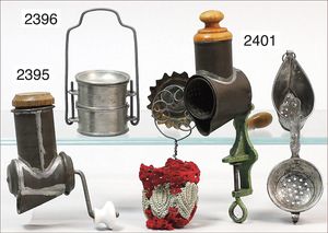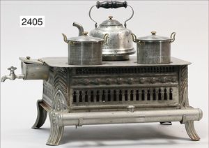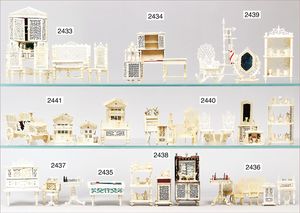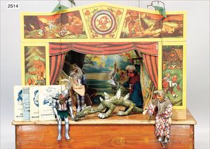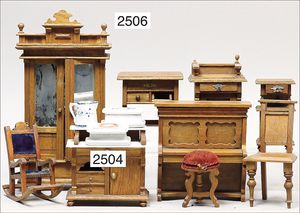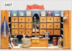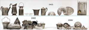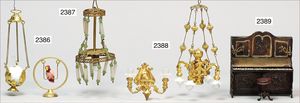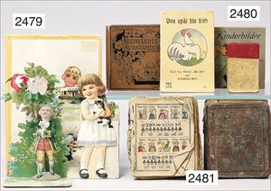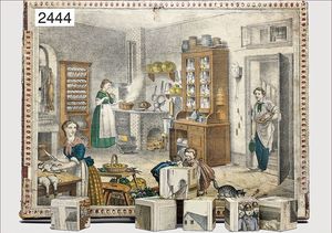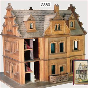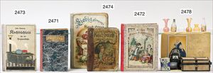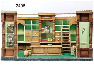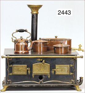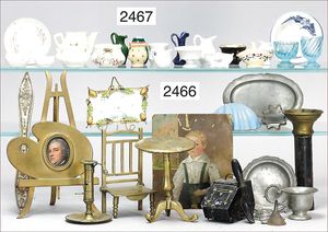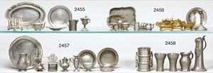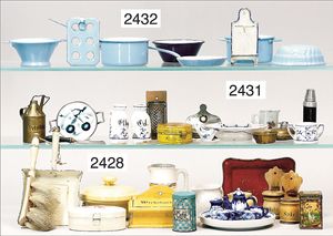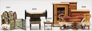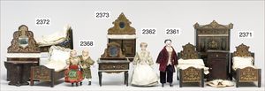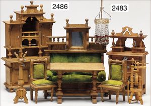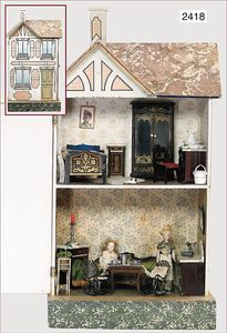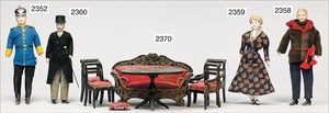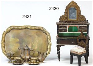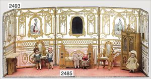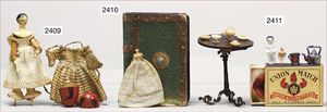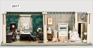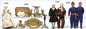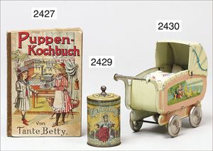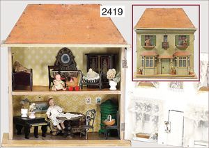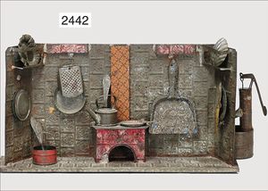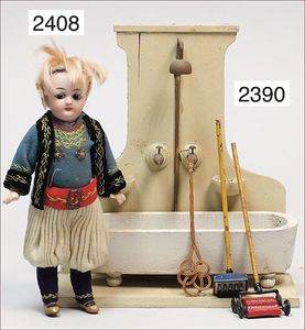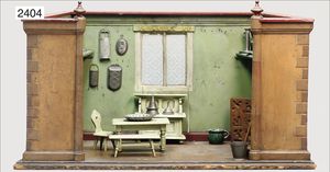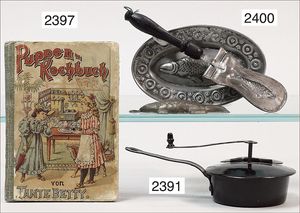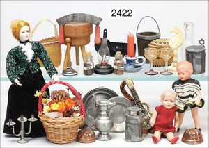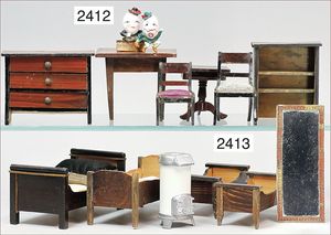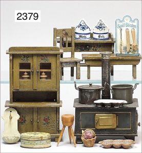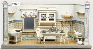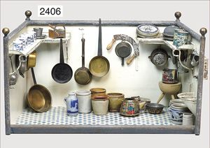 Puppenküche, Holz, trapezförmig, Länge 88 cm, Tiefe 37 cm, Höhe 46 cm, Tapete Delfter Kachelmuster, 1 Fenster verglast, mit reichhaltig Zubehör, Holzmobiliar, Geschirrschrank, Höhe 32 cm, Anrichte, Tisch, 2 Stühle, Schrank, dazu 1 Zinn-Kaffeeservice, 1 kl. Säge, Alter ?, 3 Porzellan- bzw. Glasschalen, mit Deckel (2 x Huhn, 1 x Schwan)