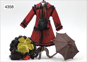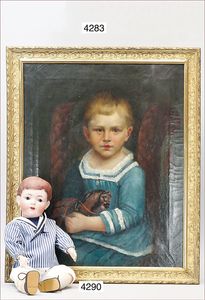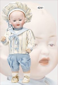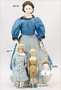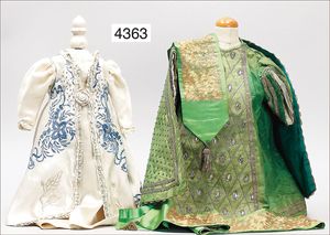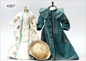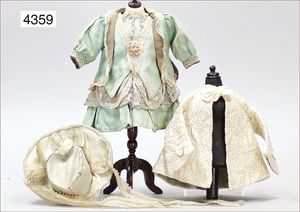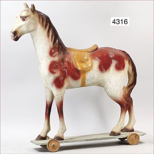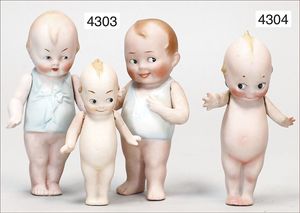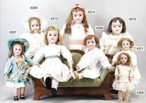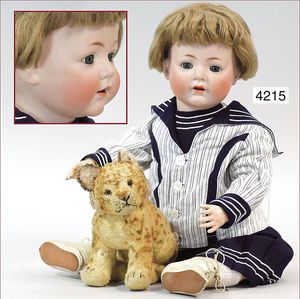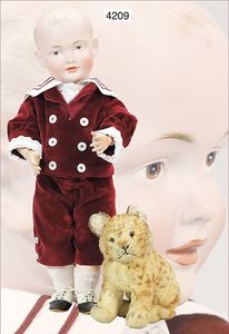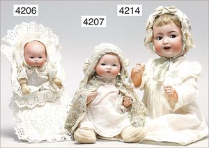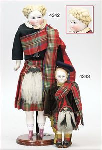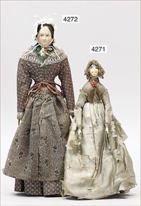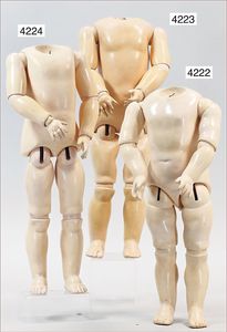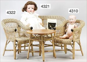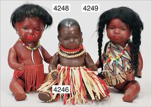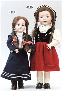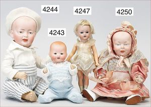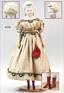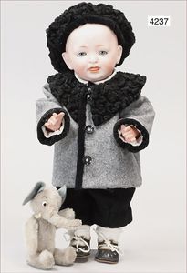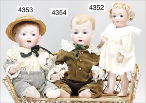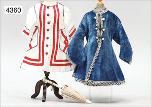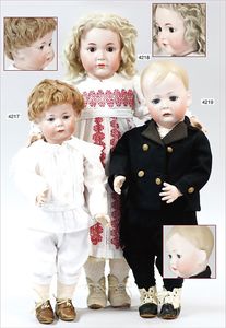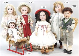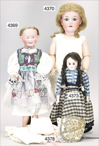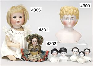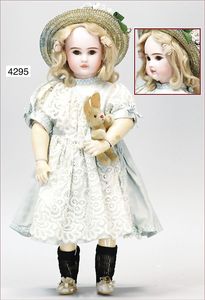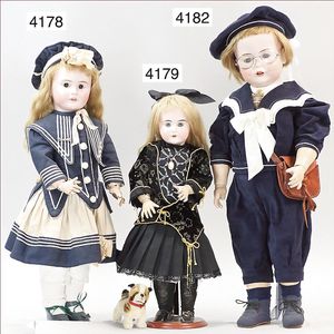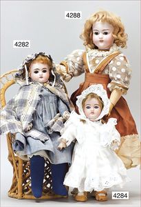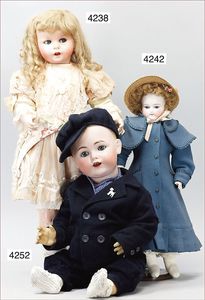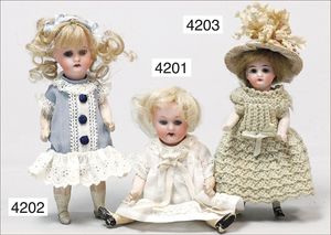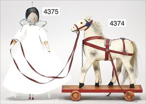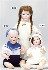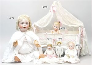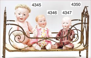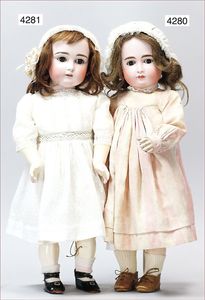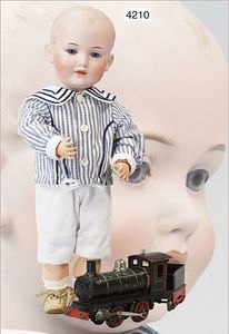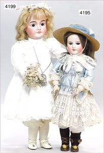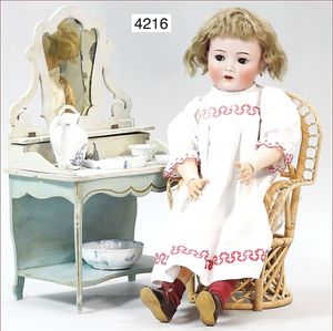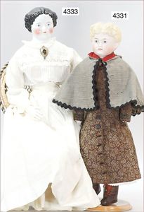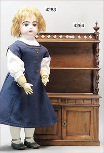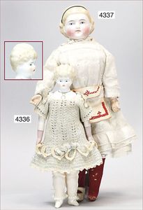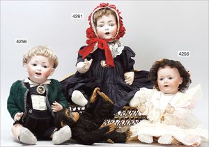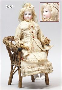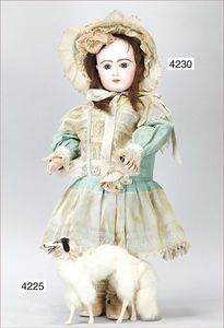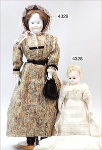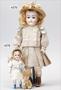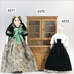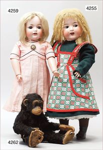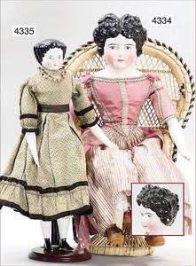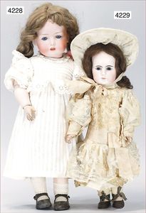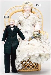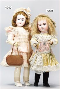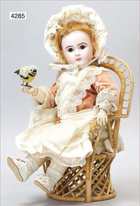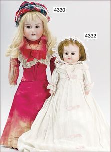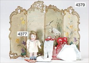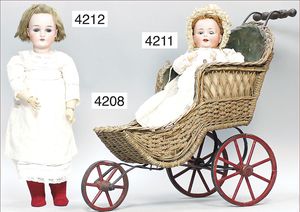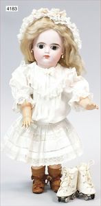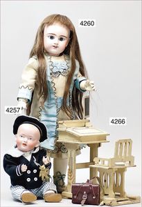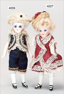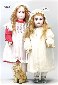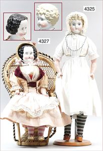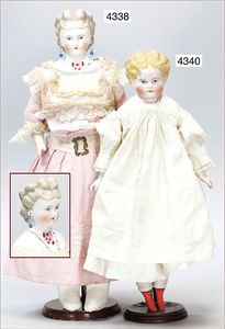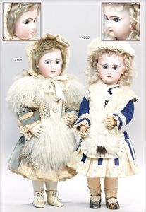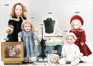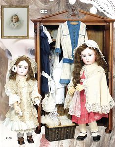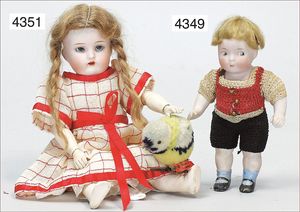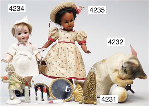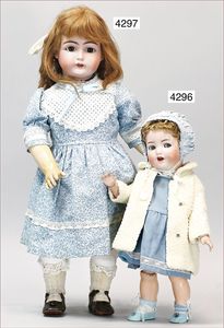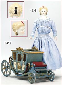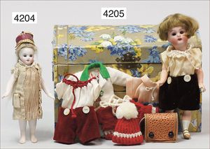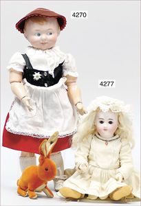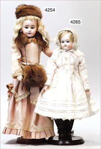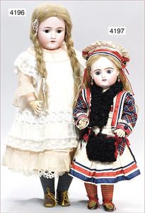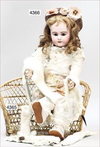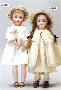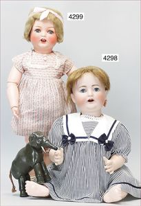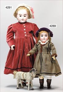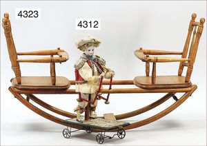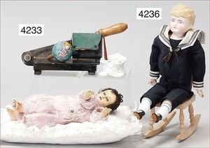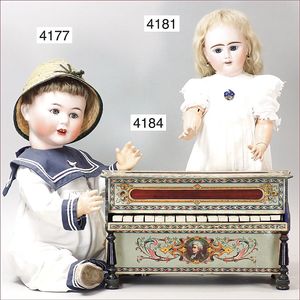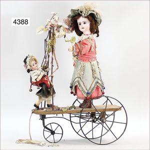 Zugspiel, Halbautomat, für franz. Markt, 70 cm hoch, 2 Biskuitporzellankopf-Puppen, 1 x Puppe SIMON & HALBIG, Dep. 1079, Mohairperücke, braune Schlafaugen, off. Mund, Zähne, Masse-Gliederkörper, auf Schaukel sitzend, 1 x Puppe Kopf JUMEAU, gemarkt 6, fest eingesetzte blaue Paperweightaugen, off. Mund, Zähne, Kinngrübchen, Mohairperücke fest aufgeklebt, durchst. Ohren, Masse-Stehkörper, Puppe bewegt die Arme, ausgef.
