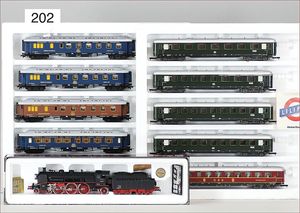 Konv. Puppenstuben-Zubehör, Glasservice, Tassendurchm. ca. 1,5 cm, orange gestreift, Kanne, Becher, Karaffe, 1 Holz-Kaffeeservice, Tassendurchm. ca. 1 cm, mit Tupfen, Teller, 1 Besteckkasten, 4-teilig, mit Schöpflöffel, Länge Messer ca. 8 cm