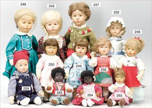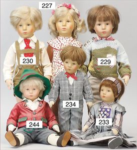 Konv. 6 Stoffpuppen, weich gestopft, Hersteller ?, gemalte Augen, mit Perücken, ca. 40 cm