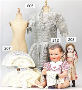 Konv. Puppen- und Kinderkleidung, meist Weißwäsche, 2 Nerze, 2 Puppenschirme, etw. Modeschmuck, 1 Porzellan-Puppenkopf, ALT, BECK & GOTTSCHALCK, 1353, blaue Schlafaugen, offener Mund, Zähne, Mohairperücke