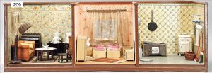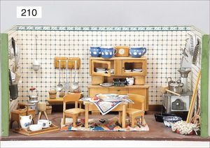 Puppenküchengehäuse, Holz, trapezförmig, Länge 1 m, Höhe 40 cm, Tiefe 44 cm, mit einigen Teilen Mobiliar, Küchenschrank, Anrichte, 1 Stuhl, Tisch, 1 Hängebord, 1 Tellerbord, kl. Blechherd, u.a.