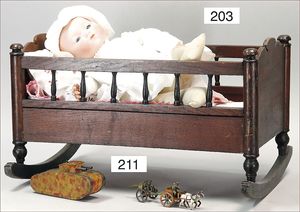 Puppenwiege, Korb auf Holzgestell, mit Rädern, neuer, Höhe 50 cm