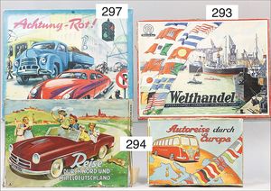 2 Spiele, wohl nicht komplett, 1 x ,,Achtung-Rot", von Noris-Spiele, 1 x ,,Auf Autostraßen durch Europa" (Klee-Spiel), Kart. etw. eingerissen