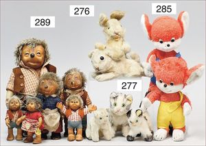 STEIFF Konv. 5 Teile, alles bespielt, 1 x Eisbär, mit Knopf, Länge 15 cm, kleiner Jocko, mit Knopf, 16 cm, 1 x Widder, 1 x Fuchs, 1 x Igel, alles ohne Knopf und Schild, Igel Joggi, mit Schild