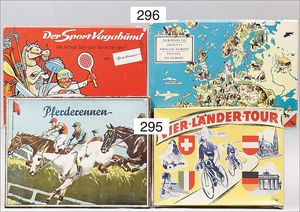2 Spiele, 1 x ,,Lustiges Wettrennen", darin 9 Bilderstempel, im Orig.-Kart., 1 x ,,Zahlenknirps", Spieltruhe Morlesau bei Hammelburg, Orig.-Schachtel mit 5 Würfeln