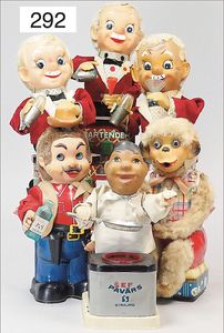 Konv. 4 Figuren, zum Aufziehen, 2 x Clown, 1 Bär, 1 Page mit Zigaretten, Hersteller ?, einige Kleinteile fehlen, Uhrwerke teilw. intakt, bzw. 1 x überdreht