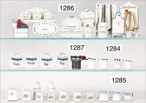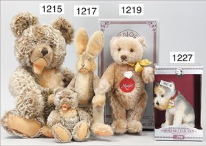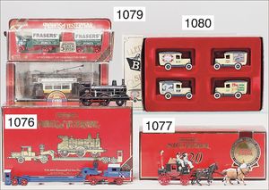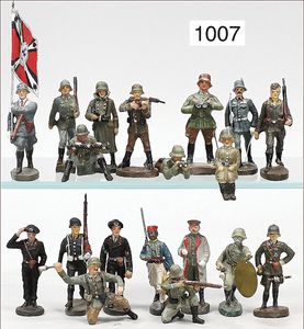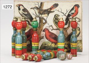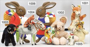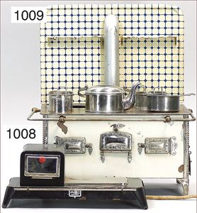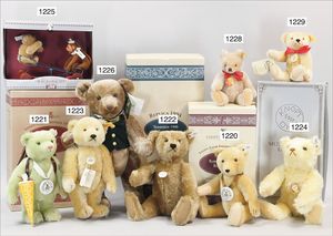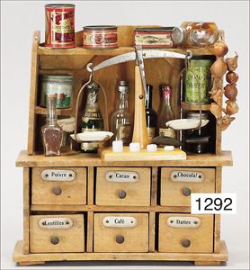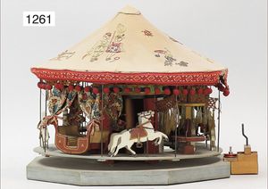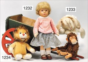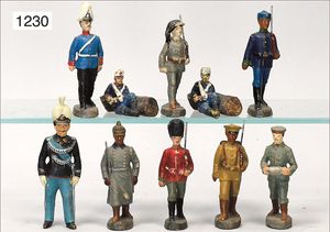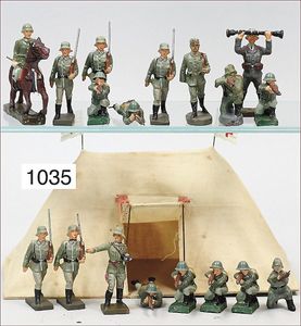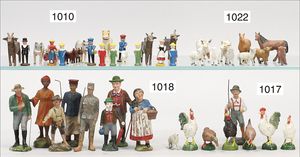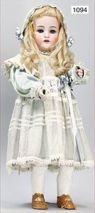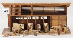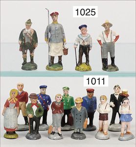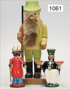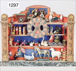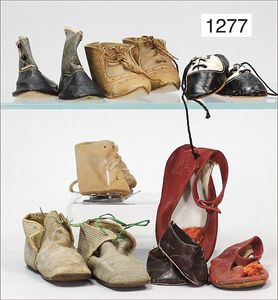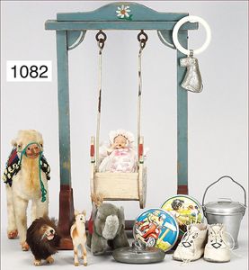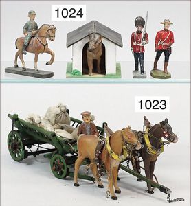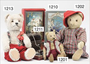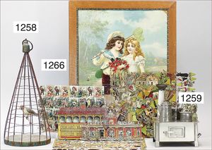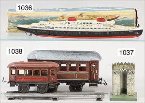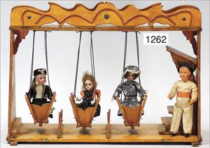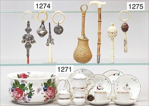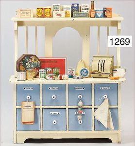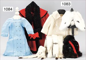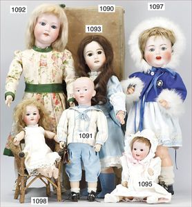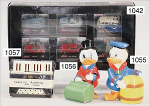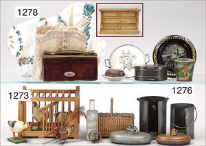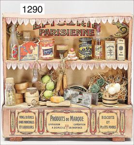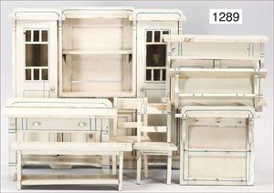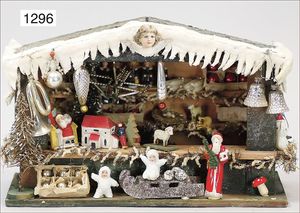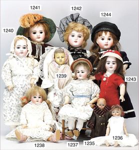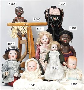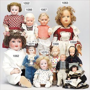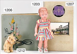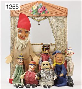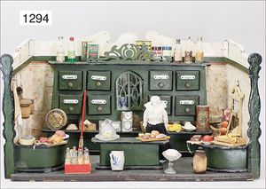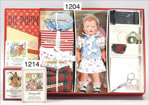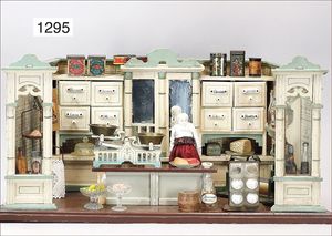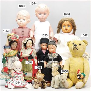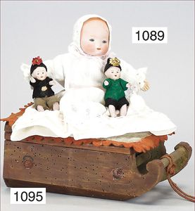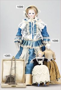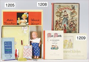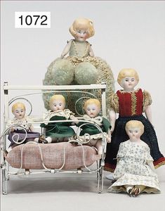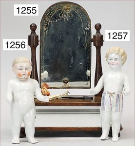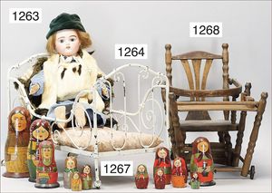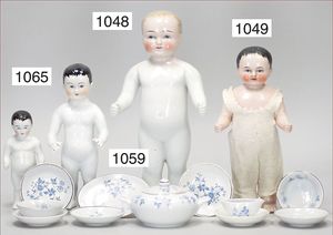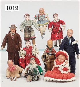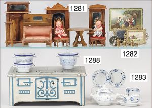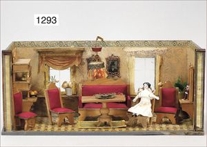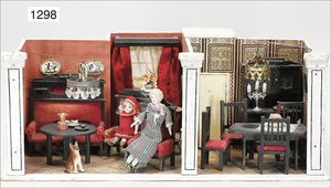 2-teilige Puppenstube, mit Erker, Durchgangstür, 1 Fenster verglast, Länge 56 cm, Tiefe 22 cm, Höhe 20 cm, mit Holzmobiliar, stoffbespannt, einige Ausschmückungsteile, dazu 2 Porzellan-Puppenstuben-Puppen, 1 x Brustblattkopf-Puppe, mit modellierter Frisur, Stoffkörper, Porzellan-Arme und -Unterschenkel, 15 cm, 1 x Puppenstuben-Puppe, Vollporzellan, bewegliche Arme und Beine, anmodellierte Schuhe und Strümpfe, eingesetzte Glasaugen, Mohairperücke, 10 cm